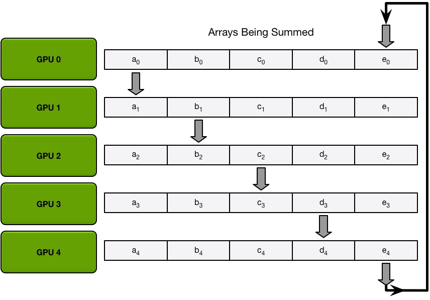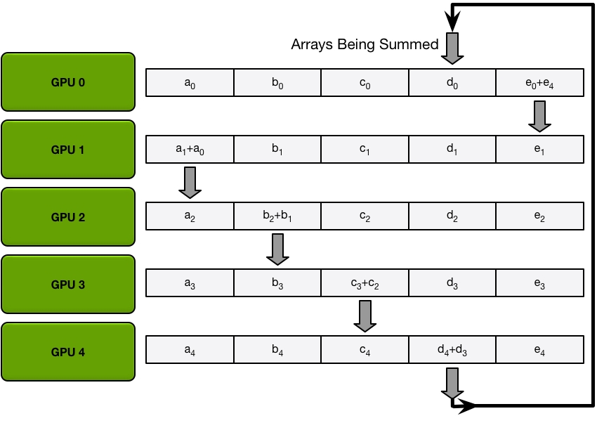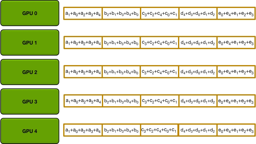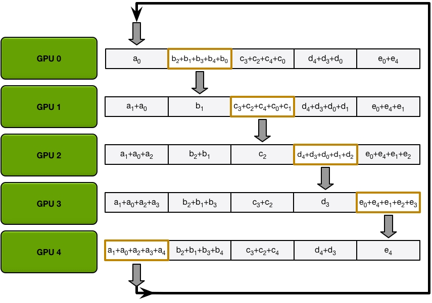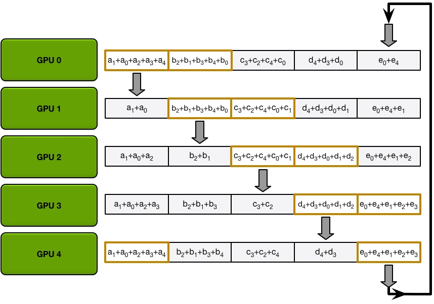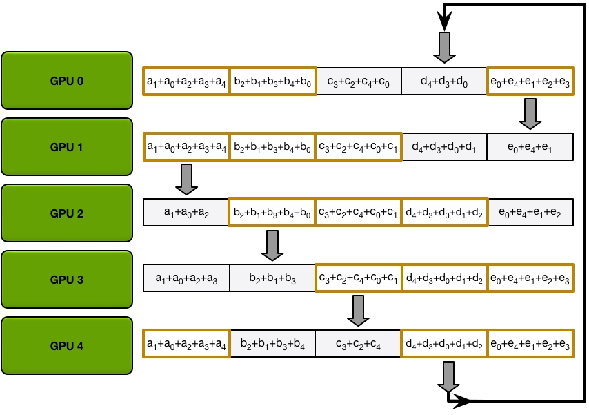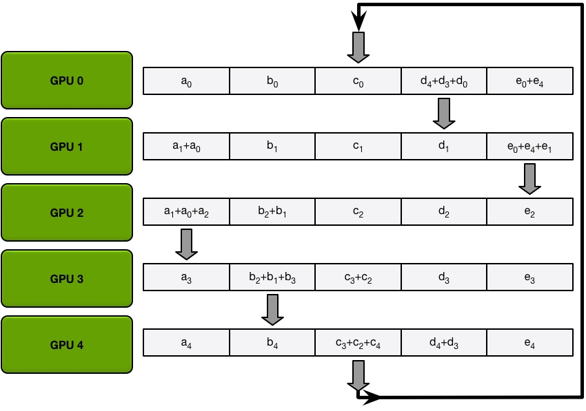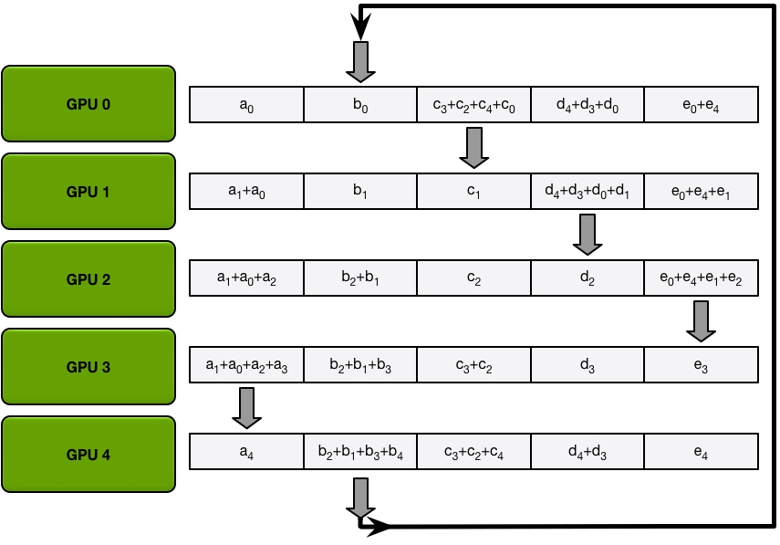 Send and recv as a ring situation: In deep learning, the AllReduce reduction can be achieved by Ring AllReduce, each worker receives a partial from the backward neighbor and sends a different partial to the forward neighbor. After N times, all workers have accumulated a fixed partial from all other workers, and then broadcast its completed part to others. Details can be seen on this blog.